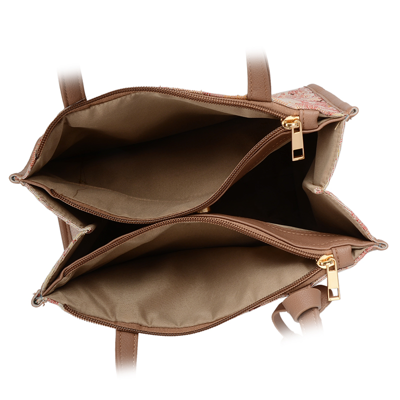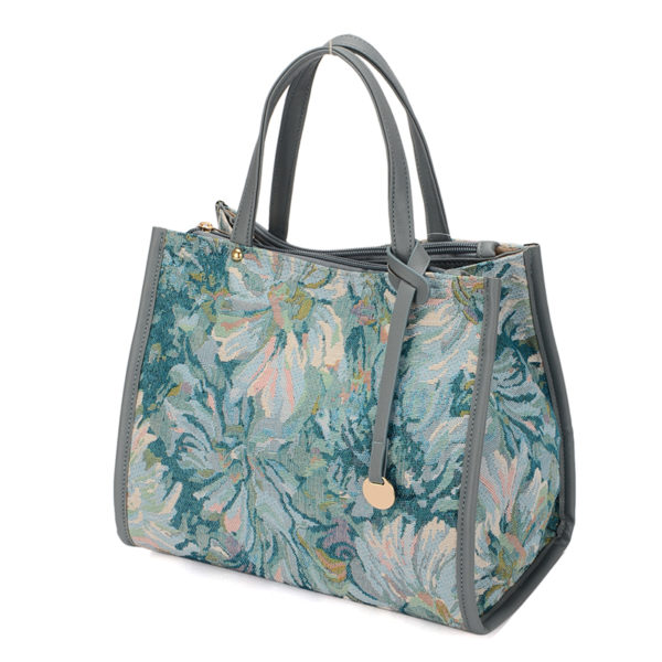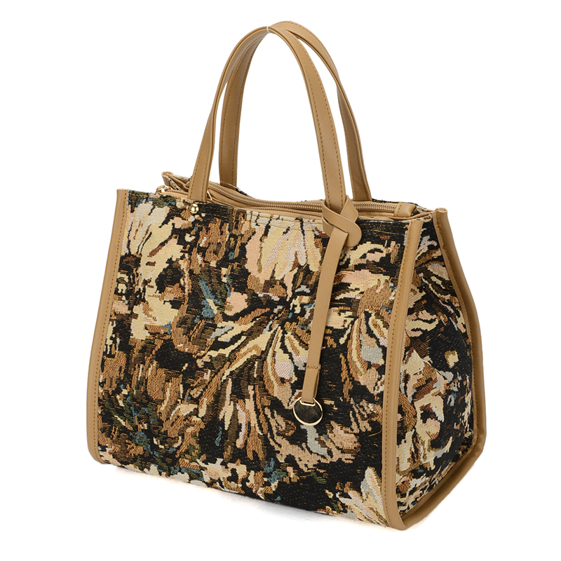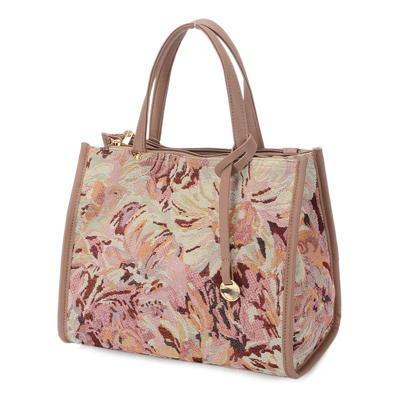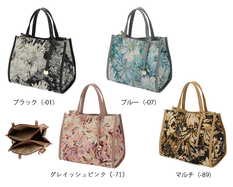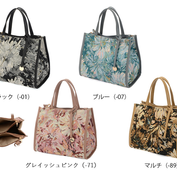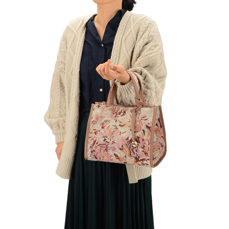 45695 レモナ CATEGORIESAvancer45695 レモナ油絵風のジャガード織の生地が目を惹くハンドバッグです。使い勝手の良いスクエアーフォルムと平手ハンドルなので腕にかけても痛くなりづらいのも嬉しいポイント。シンプルなコーディネートと合わせてアクセントにもなります。メインでもサブでもお使い頂けます。2025AW: Avancer素材:ポリエステル/合成皮革サイズ:26×21.5×14cm重量:285g