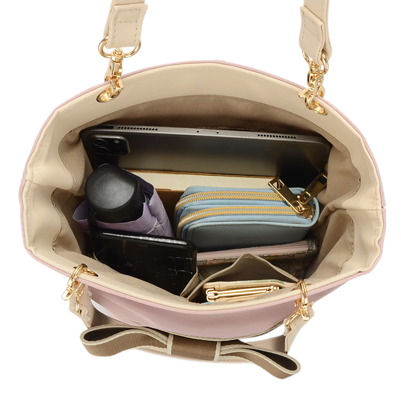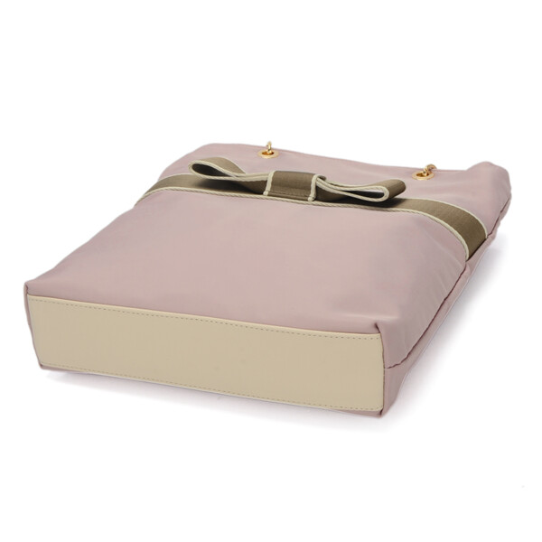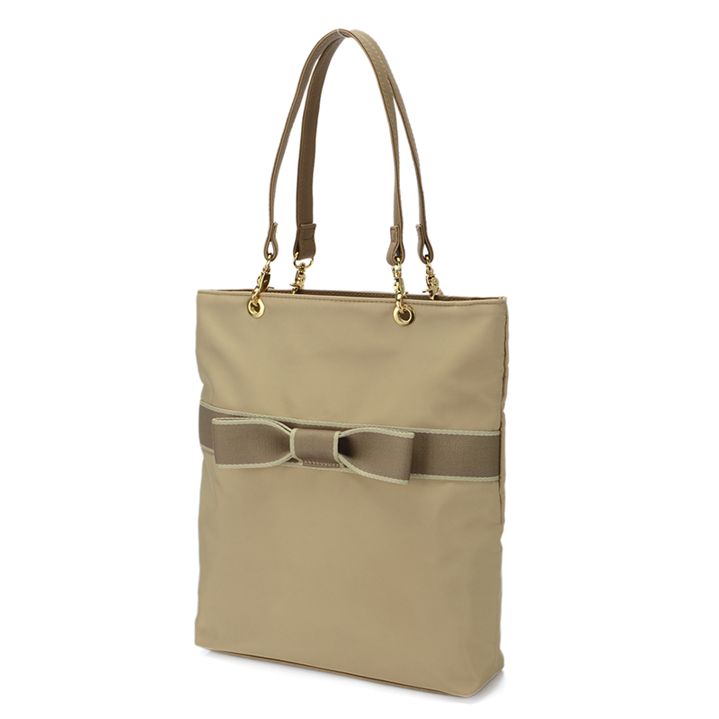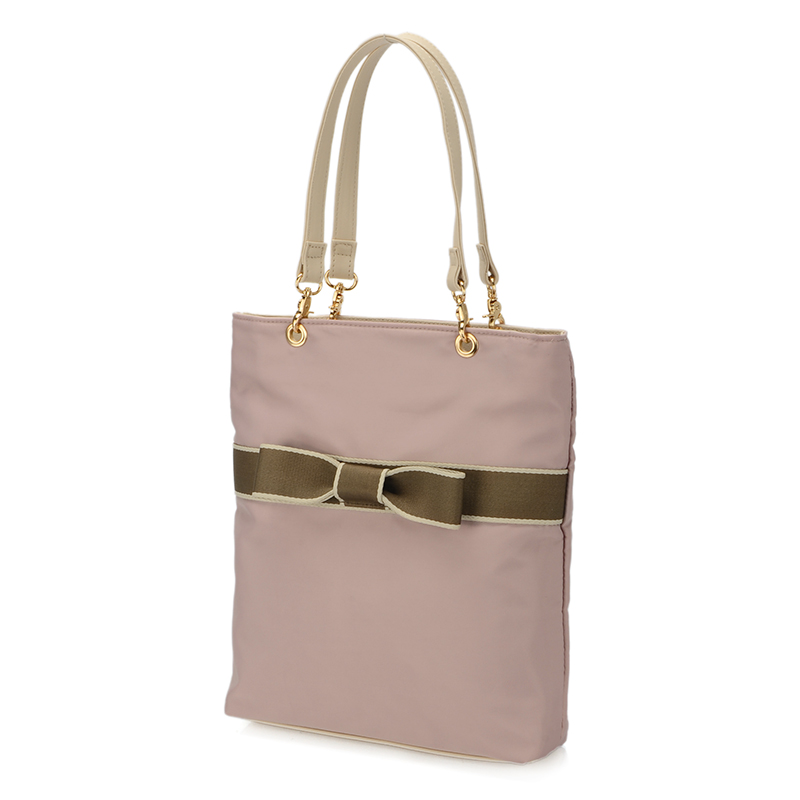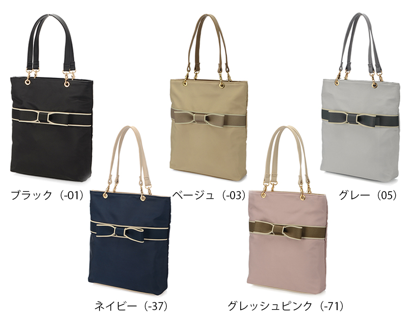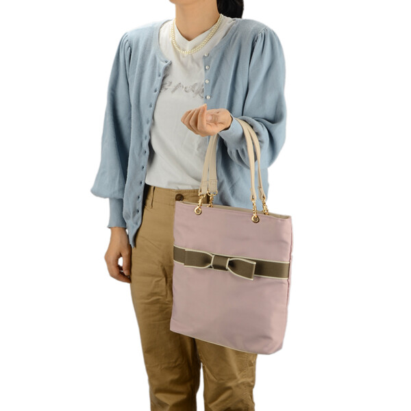 フロントにあしらわれたリボンが、上品なアクセントの手提げバッグ。